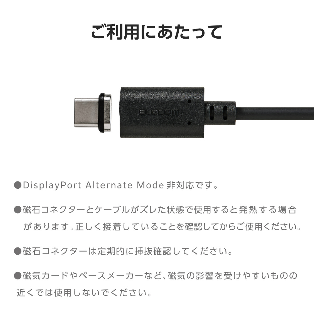 ※磁石コネクターとケーブルがズレた状態で使用すると発熱する場合があります。正しく接着していることを確認してからご使用ください。
