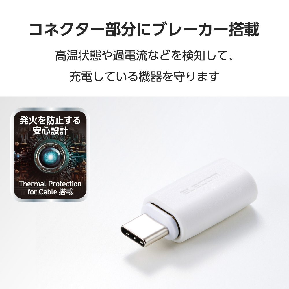 Thermal Protection for Cableを搭載。コネクター部分にブレーカーを内蔵し、高温状態や過電流を検知して電流を遮断します。異物の挟み込みや水滴がついた状態などの意図しない接続によるショートや発熱・発火から機器を守り、常温・正常な状態に戻れば引き続き使用できます。