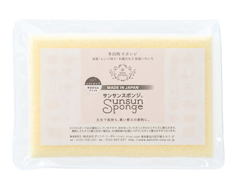 このスポンジは圧縮加工しているため、封を切っていただくと手のひらサイズに膨らみます。