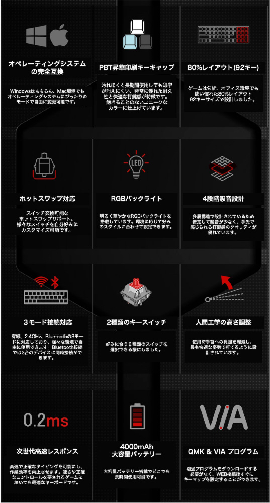 有線、2.4GHz、Bluetoothの3モードに対応した80%レイアウトのメカニカルキーボード。