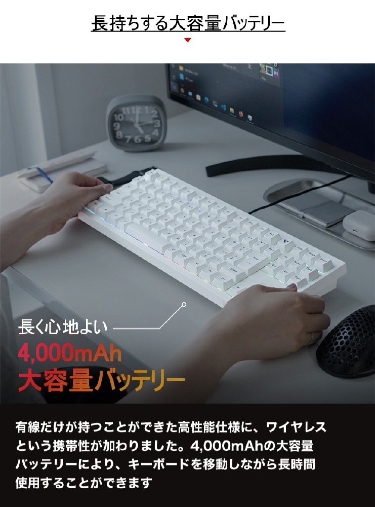 8kHzポーリングレート、入力遅延0.2msの応答速度に対応しており、ビジネスだけではなくゲーミングにも最適なキーボードです。指が吸い込まれるような滑らかな打鍵感のSILENT MINTスイッチを採用、ビジネスシーンに最適な静音設計で優しくスムーズな押下感が特徴です。またQMK/VIA WEBプログラムを採用し、作業効率を向上させます。