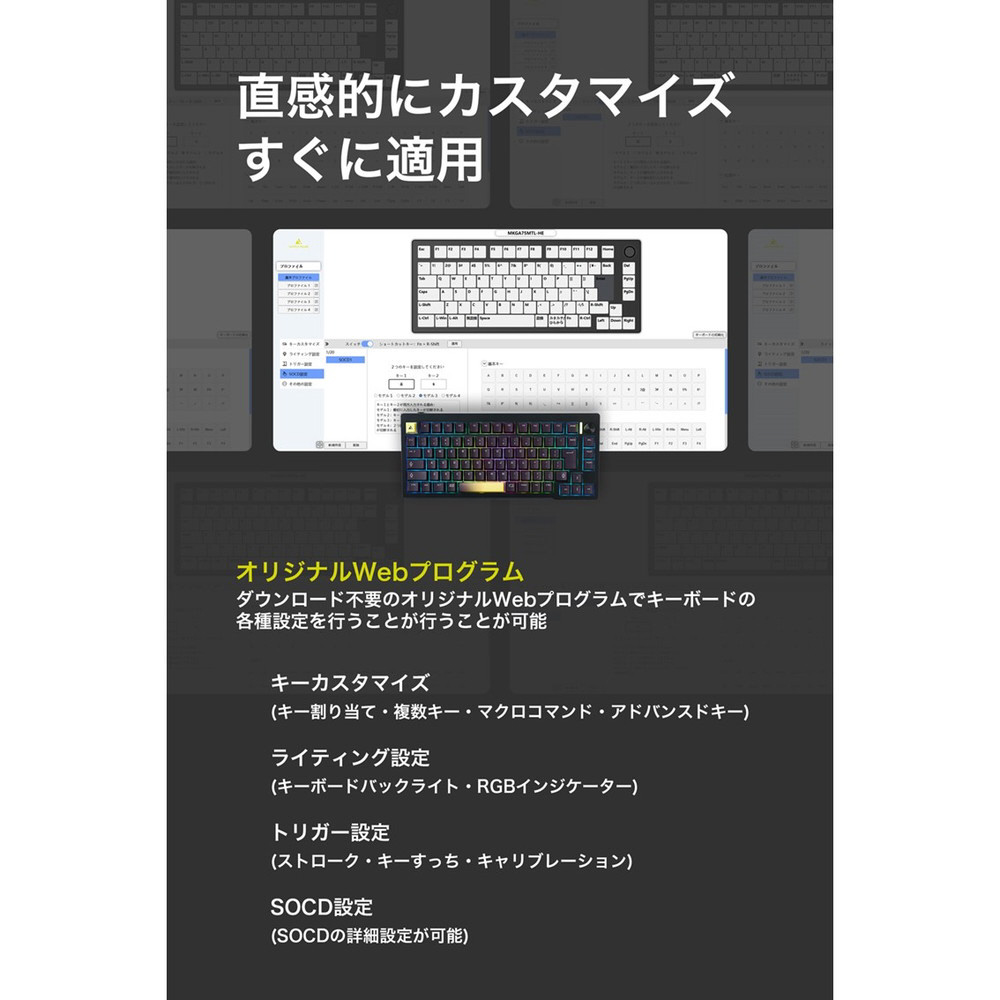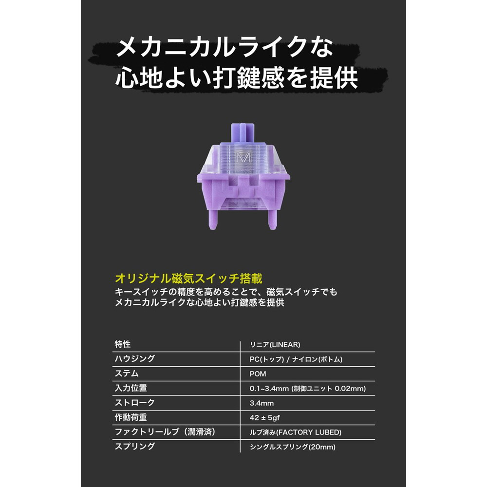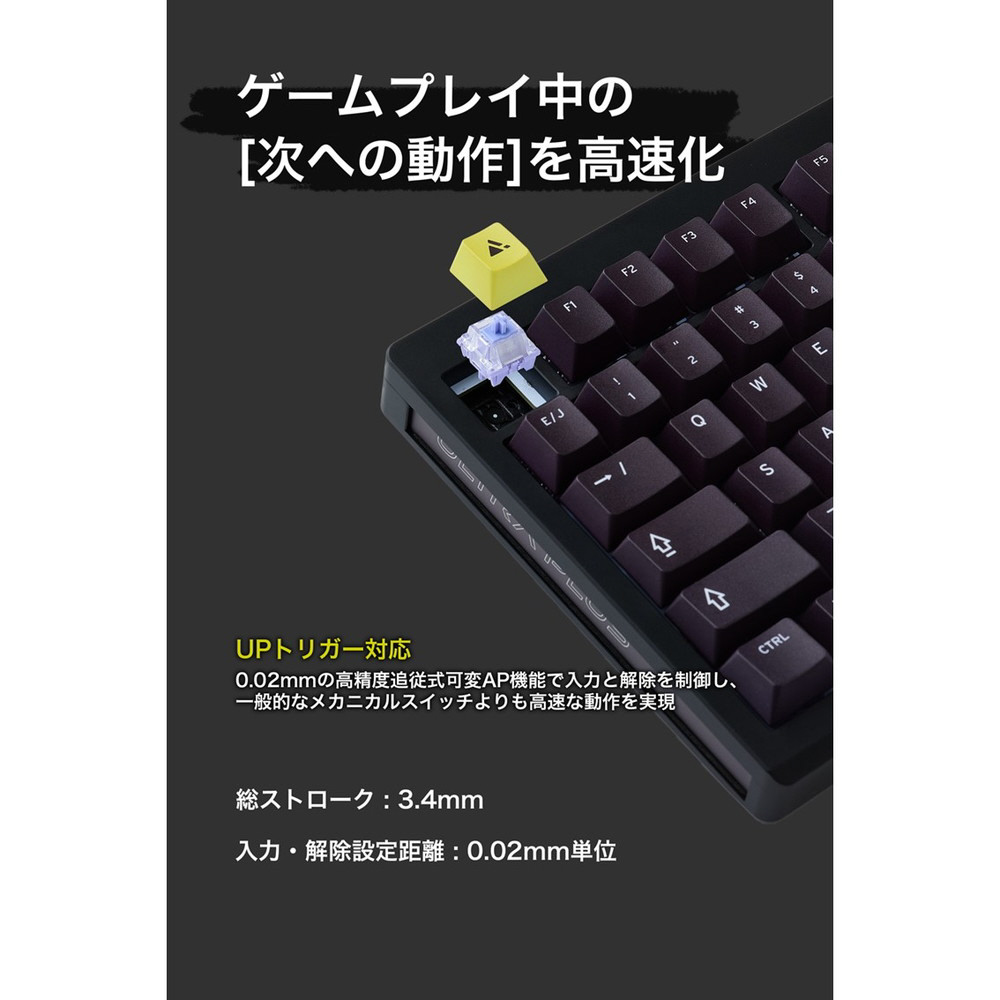 キーボード=入力機器の原点というコンセプトを踏襲しつつ、UPトリガー(高精度追従式可変アクチュエーションポイント機能)を新たに追加、カスタマイズされたオリジナル磁気スイッチはキースイッチの精度を高めることで、磁気スイッチでもメカニカルライクな心地よい打鍵感を提供します。