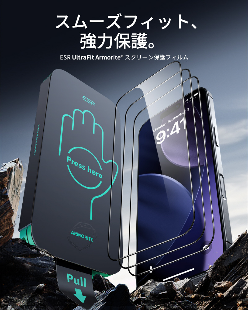 付属品 Armoriteスクリーン保護フィルム(2枚)、クリーニングキット×2、自動ホコリ除去UltraFitトレイ、取扱説明書