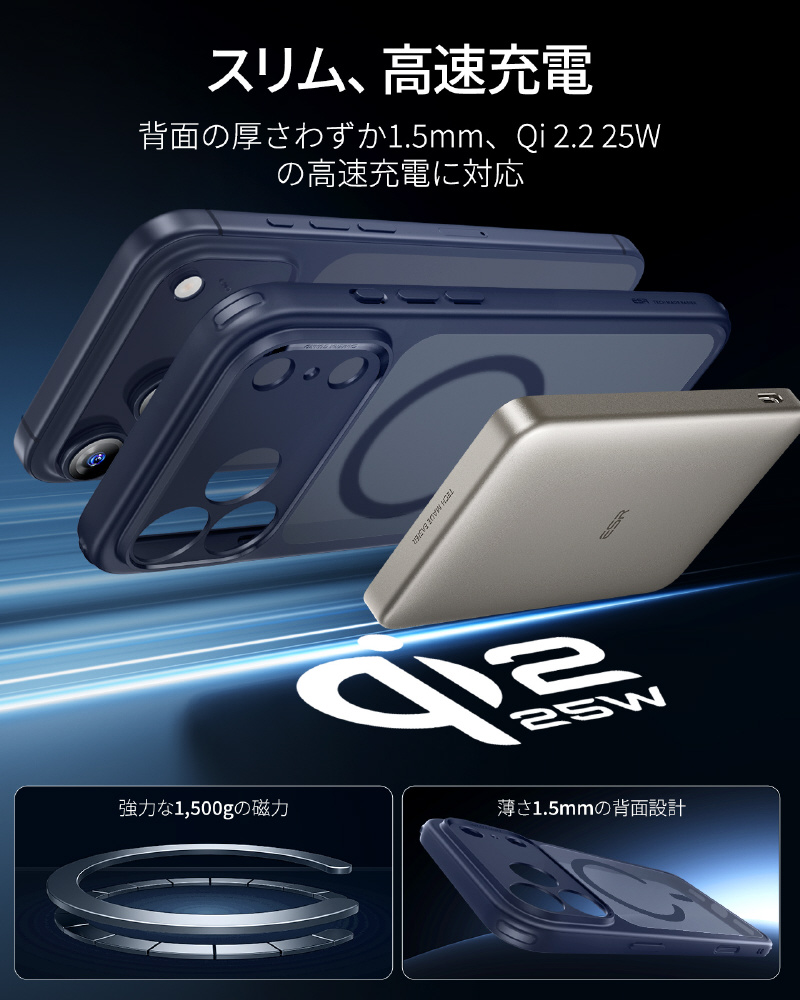 やアクセサリーが瞬時に「ピタッ」と吸着するため、満員電車や急いでいる時でも位置調整の手間が不要です。充電中のずれ落ちやアクセサリーの外れが心配ない設計で、移動中やアウトドアでの利便性が格段に向上します