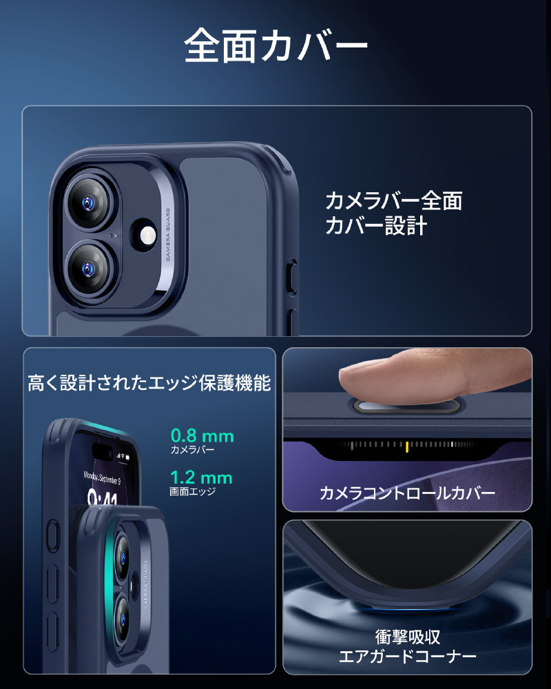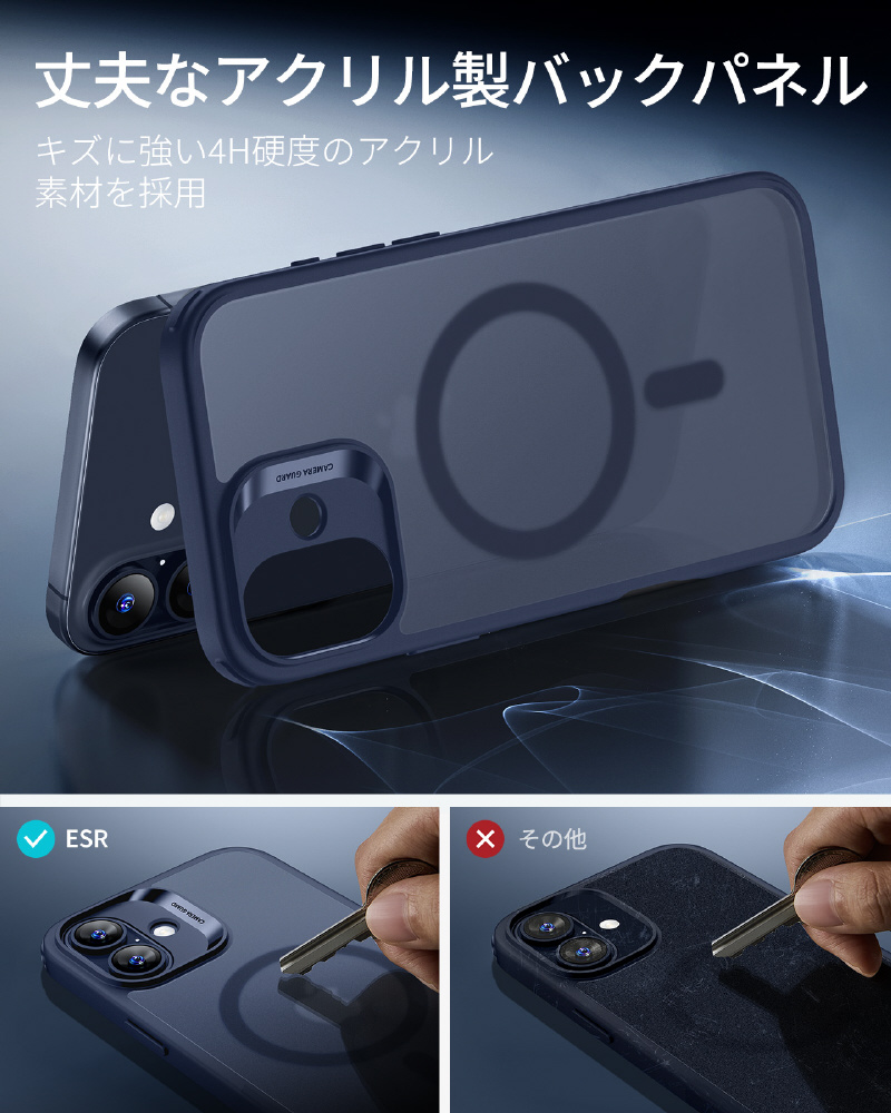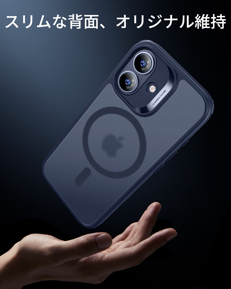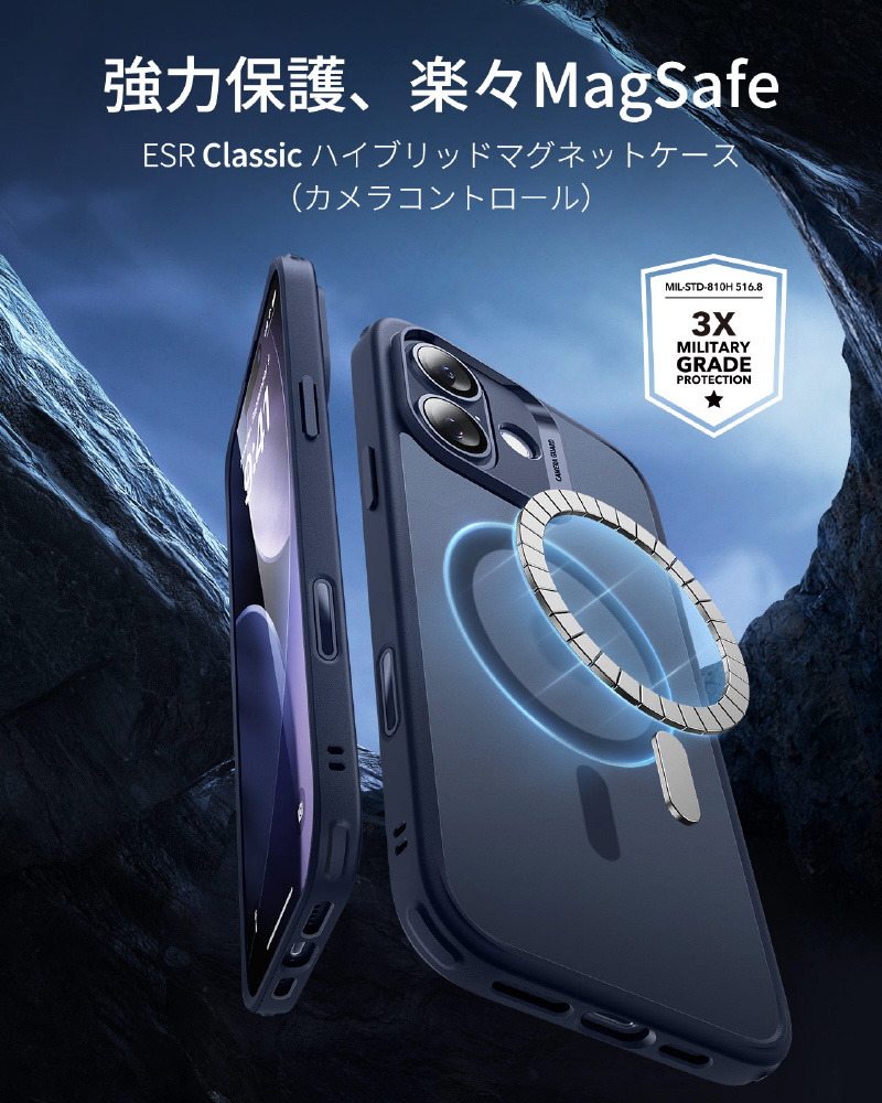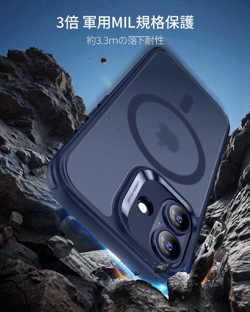 米軍規格MIL-STD-810Hの落下試験に合格したエアガードコーナー(認証番号:GZMR231203686802)を採用します。コンクリートへの高さ3.3メートル落下テストにも耐える設計で、駅のホームでの使用や登山中など、アクティブなシーンでも安心できます。うっかり落とした時も、大切なiPhoneを確実にプロテクトします