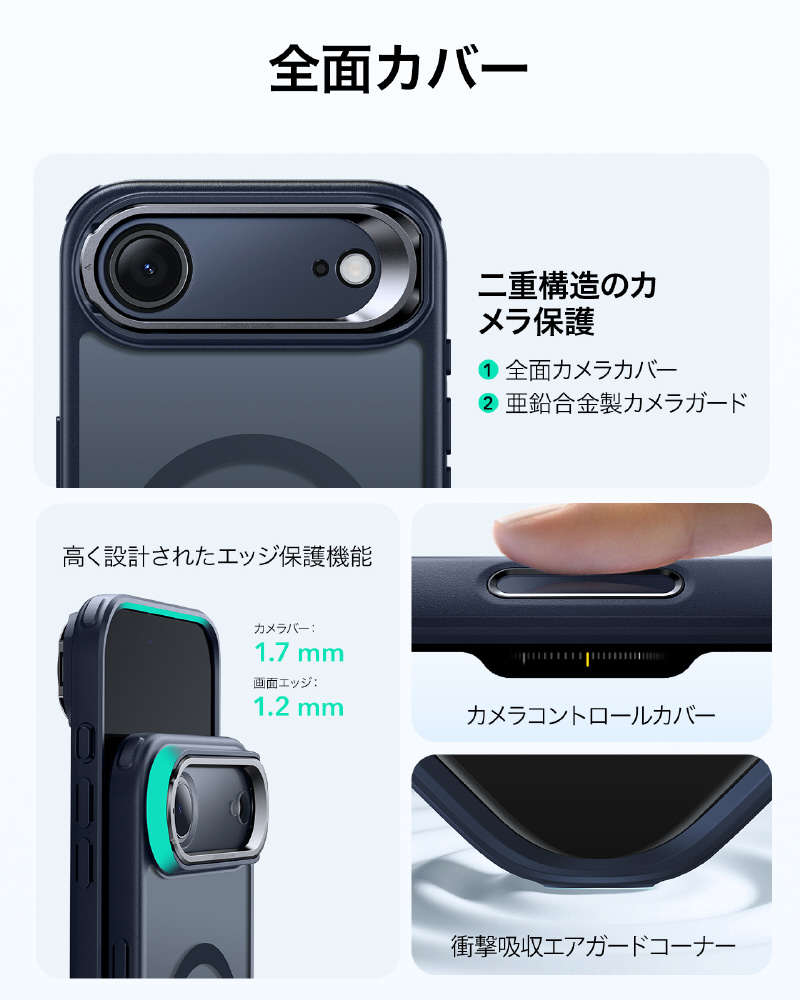 カメラレンズはスマホの命です!このiPhone17ケースはレンズ全体を覆うフルカバーと、丈夫な亜鉛合金製スタンドの二段構えで傷から徹底保護します。さらに周辺部よりわずかに高く設計されているため、置くときや落とした時の擦り傷やキズからもレンズを守ります。機能性と美しい一体感を実現したデザインです