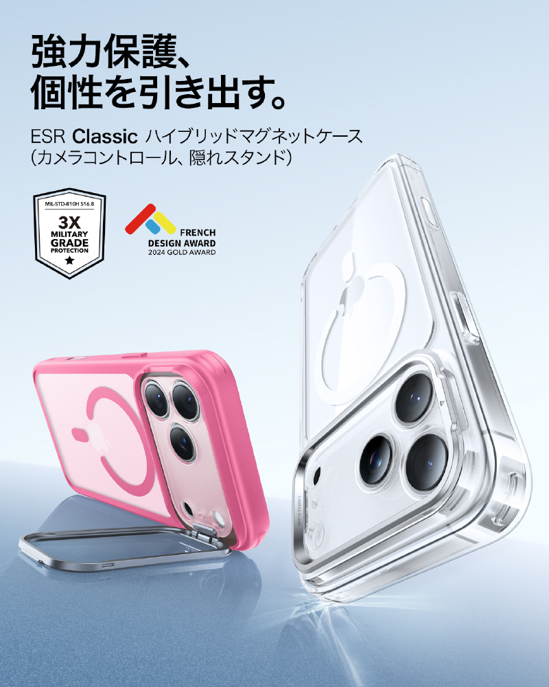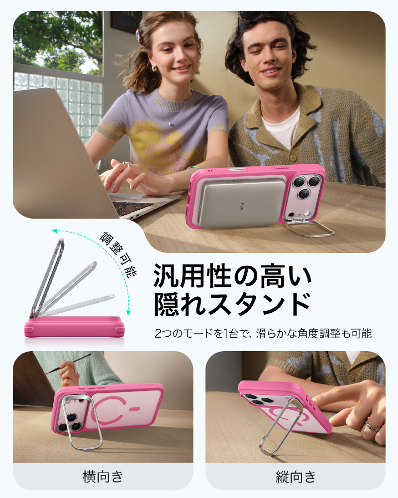 「スタンドケース、便利だけど邪魔じゃない?」いいえ、このスタンドは隠蔽式です!必要な時だけに出し、縦位置・横位置を自由自在に調整可能で、YouTube視聴はもちろん、TikTokやInstagramの縦長動画のライブ配信にも最適です。この独創的なデザインは、フレンチデザインアワード2024ゴールド賞を受賞しました!スタンドを使いながら同時にMagSafe充電もでき、革命的な便利さです