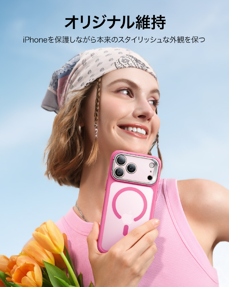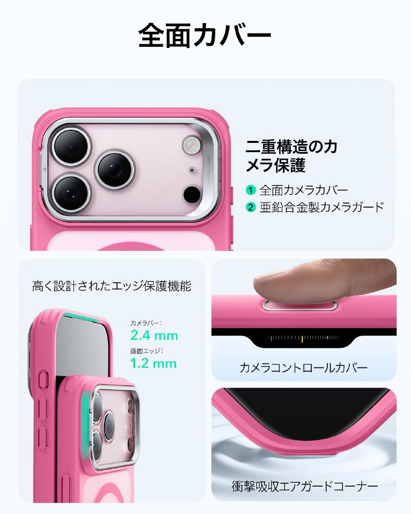 カメラレンズはスマホの命です!このiPhone17ケースはレンズ全体を覆うフルカバーと、丈夫な亜鉛合金製スタンドの二段構えで傷から徹底保護します。さらに周辺部よりわずかに高く設計されているため、置くときや落とした時の擦り傷やキズからもレンズを守ります。機能性と美しい一体感を実現したデザインです