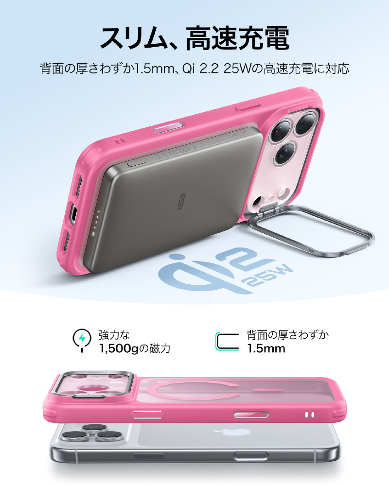 内蔵のN52M強力磁石と薄さ1.5mmのバックパネルが、最大25W充電対応の高速かつロスなしのMagSafe充電を実現します。さらに、このiPhoneケースは厳選素材と独自の抗黄変配方で、複合バックパネルと表面4H硬度処理により、長期間使用でも黄ばみやキズ(鍵やコインなども)に強く、いつまでも新品のような美しさを保ち続けます