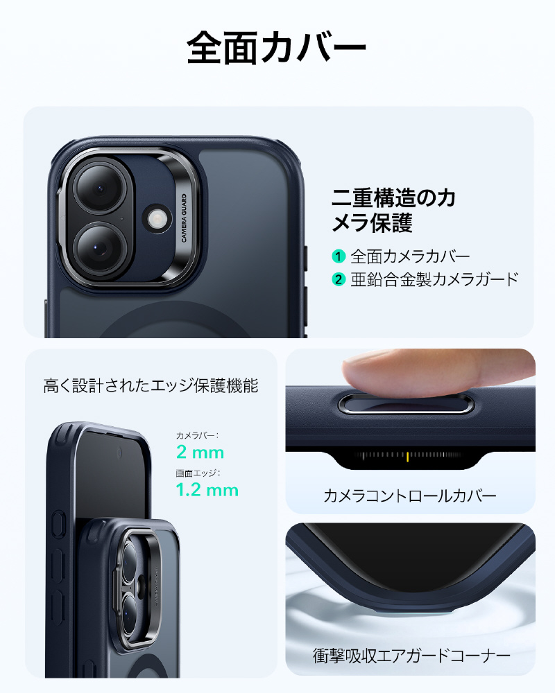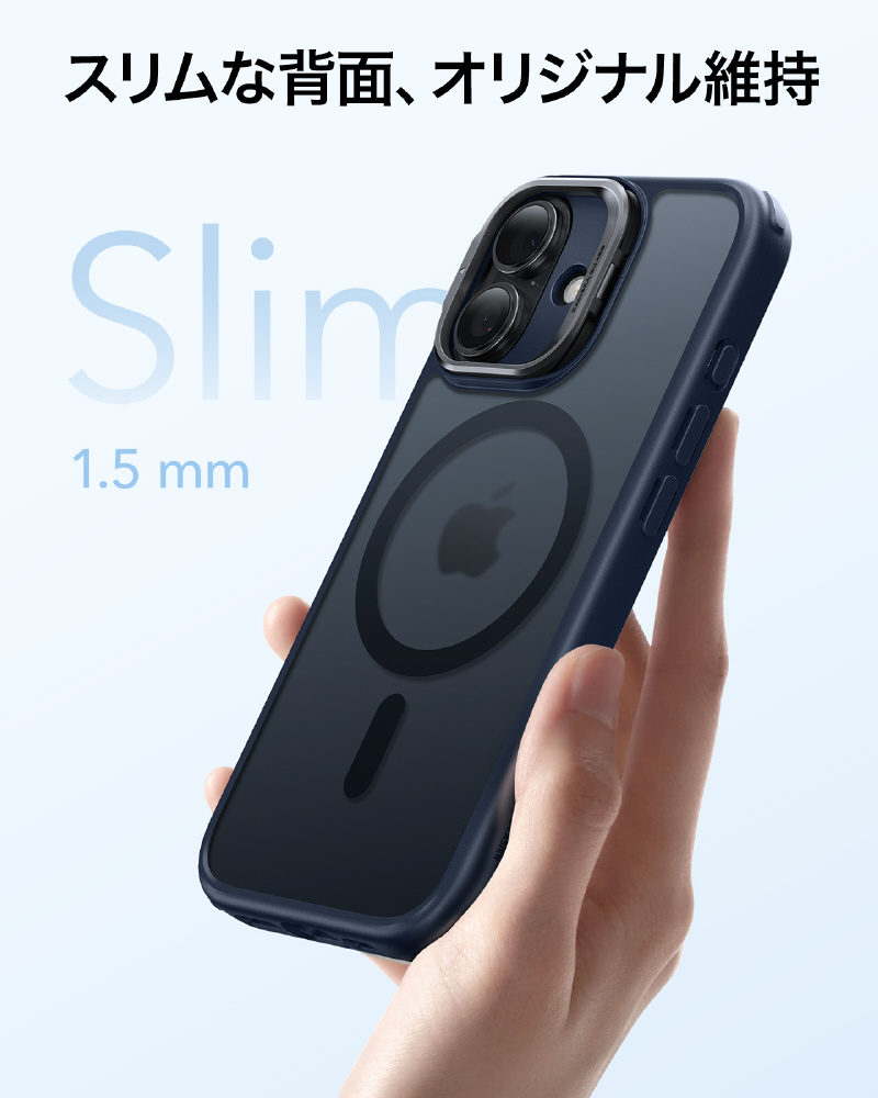 カメラレンズはスマホの命です!このiPhone17ケースはレンズ全体を覆うフルカバーと、丈夫な亜鉛合金製スタンドの二段構えで傷から徹底保護します。さらに周辺部よりわずかに高く設計されているため、置くときや落とした時の擦り傷やキズからもレンズを守ります。機能性と美しい一体感を実現したデザインです
