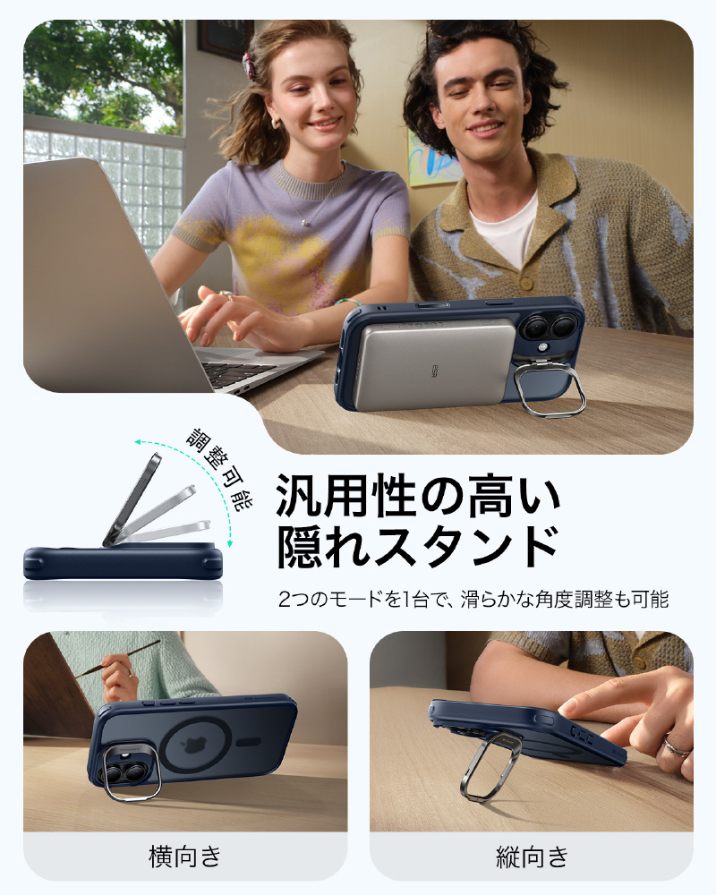 「スタンドケース、便利だけど邪魔じゃない?」いいえ、このスタンドは隠蔽式です!必要な時だけに出し、縦位置・横位置を自由自在に調整可能で、YouTube視聴はもちろん、TikTokやInstagramの縦長動画のライブ配信にも最適です。この独創的なデザインは、フレンチデザインアワード2024ゴールド賞を受賞しました!スタンドを使いながら同時にMagSafe充電もでき、革命的な便利さです