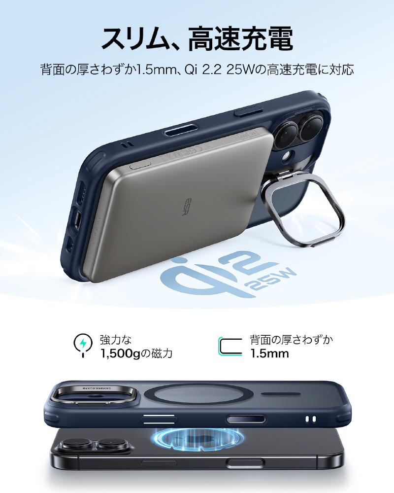 内蔵のN52M強力磁石と薄さ1.5mmのバックパネルが、最大25W充電対応の高速かつロスなしのMagSafe充電を実現します。さらに、このiPhone17ケースは厳選素材と独自の抗黄変配方で、複合バックパネルと表面4H硬度処理により、長期間使用でも黄ばみやキズ(鍵やコインなども)に強く、いつまでも新品のような美しさを保ち続けます