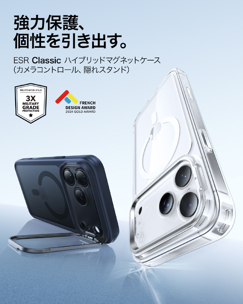 「スタンドケース、便利だけど邪魔じゃない?」いいえ、このスタンドは隠蔽式です!必要な時だけに出し、縦位置・横位置を自由自在に調整可能で、YouTube視聴はもちろん、TikTokやInstagramの縦長動画のライブ配信にも最適です。この独創的なデザインは、フレンチデザインアワード2024ゴールド賞を受賞しました!スタンドを使いながら同時にMagSafe充電もでき、革命的な便利さです