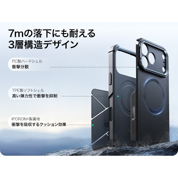 硬いTPEとPCのアウター部による3層構造は外側の衝撃や傷から保護し、クッション性の高いソフトなインナー部は内側の衝撃吸収を行い、最大約 7メートルの高さからの落下からもスマホを守ります。