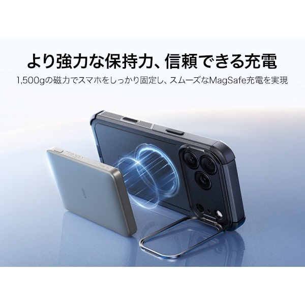 1,500gの保持力を持つ強力な内蔵マグネットが、より速く、より簡単な瞬間吸着ワイヤレス充電と、あらゆるMagSafeアクセサリーへの安全な磁気吸着固定を可能にします。