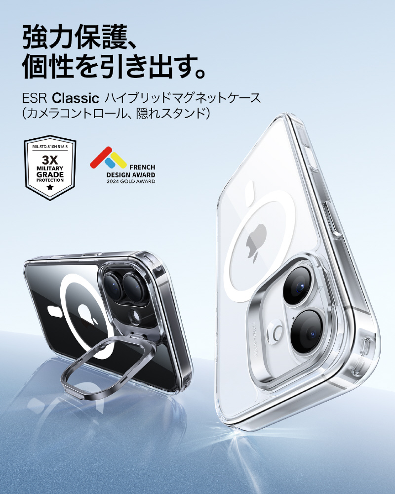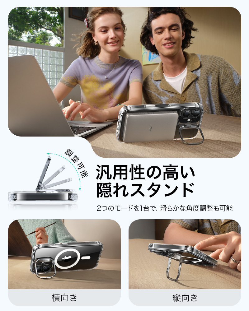 「スタンドケース、便利だけど邪魔じゃない?」いいえ、このスタンドは隠蔽式です!必要な時だけに出し、縦位置・横位置を自由自在に調整可能で、YouTube視聴はもちろん、TikTokやInstagramの縦長動画のライブ配信にも最適です。この独創的なデザインは、フレンチデザインアワード2024ゴールド賞を受賞しました!スタンドを使いながら同時にMagSafe充電もでき、革命的な便利さです