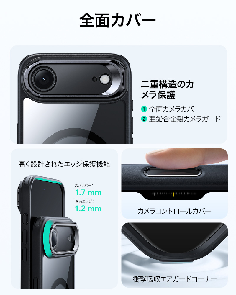 カメラレンズはスマホの命です!このiPhone17ケースはレンズ全体を覆うフルカバーと、丈夫な亜鉛合金製スタンドの二段構えで傷から徹底保護します。さらに周辺部よりわずかに高く設計されているため、置くときや落とした時の擦り傷やキズからもレンズを守ります。機能性と美しい一体感を実現したデザインです