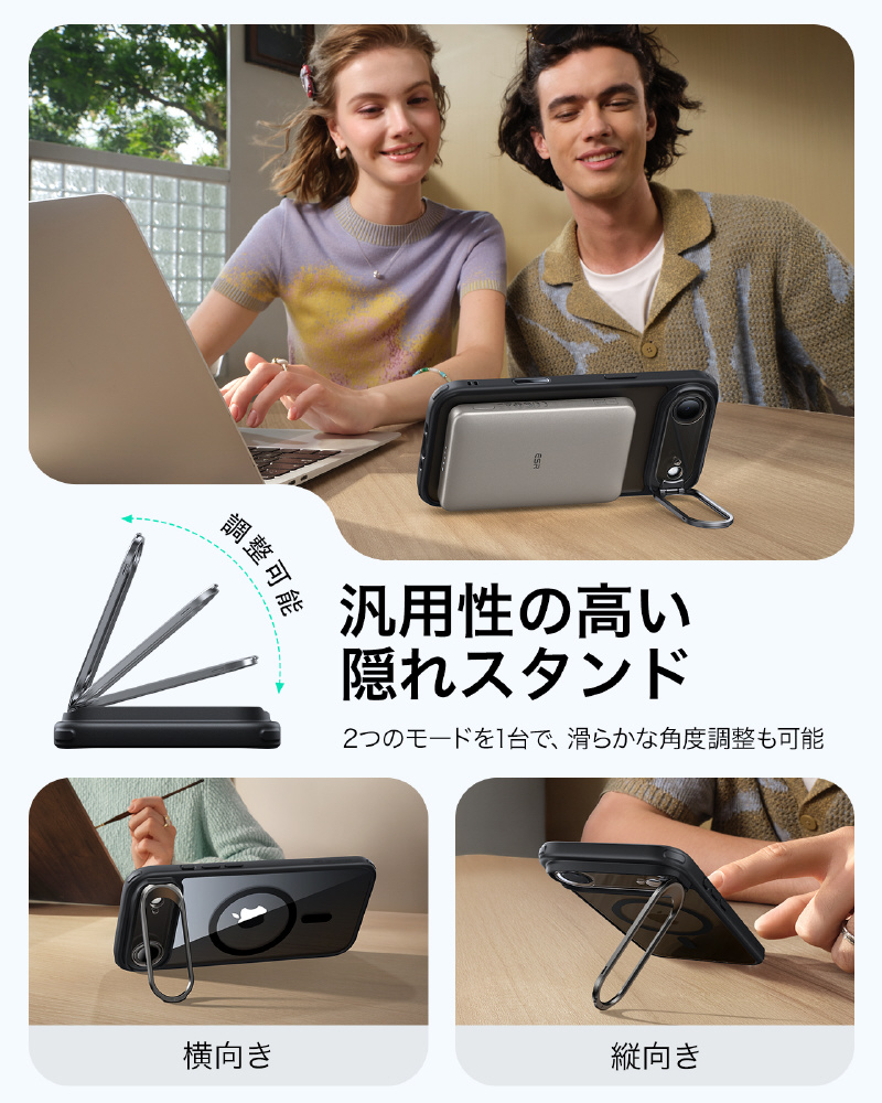 「スタンドケース、便利だけど邪魔じゃない?」いいえ、このスタンドは隠蔽式です!必要な時だけに出し、縦位置・横位置を自由自在に調整可能で、YouTube視聴はもちろん、TikTokやInstagramの縦長動画のライブ配信にも最適です。この独創的なデザインは、フレンチデザインアワード2024ゴールド賞を受賞しました!スタンドを使いながら同時にMagSafe充電もでき、革命的な便利さです
