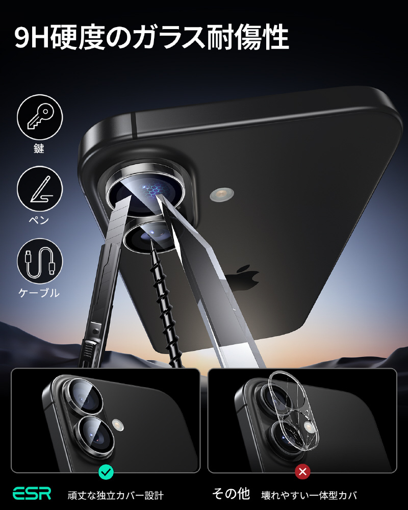 仕様2 超薄型で超透明な強化ガラスは傷がつきにくく、レンズが損傷から保護しながら、透明度抜群で高画質な写真やビデオをお楽しみいただけます。