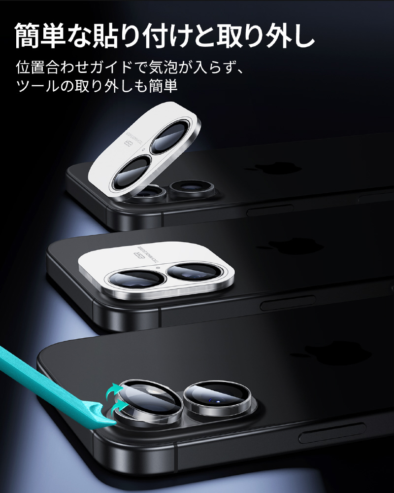 iPhone 17/16/16 Plus用 強化ガラスレンズ保護 米軍企画の強力な耐久性の独立型設計の強化ガラスプロテクター。 気泡が入りにくい取り付けフレームと簡単に剥がせる取り外し器具付き。