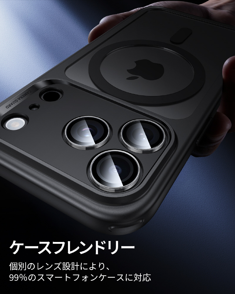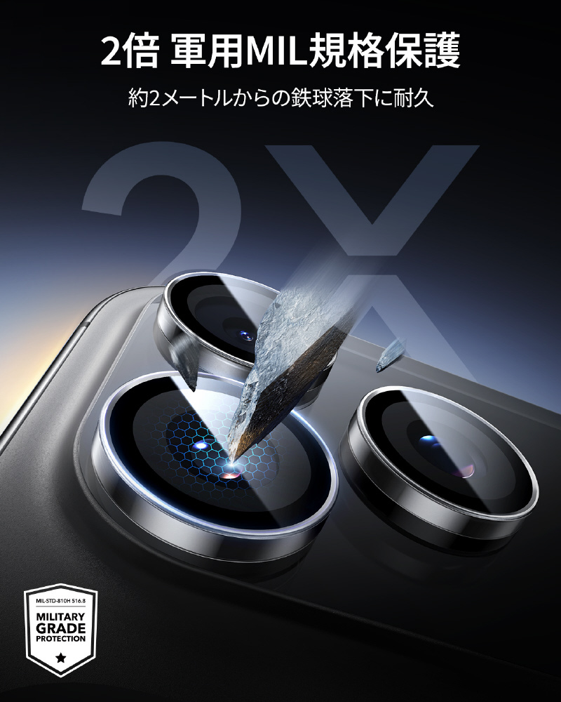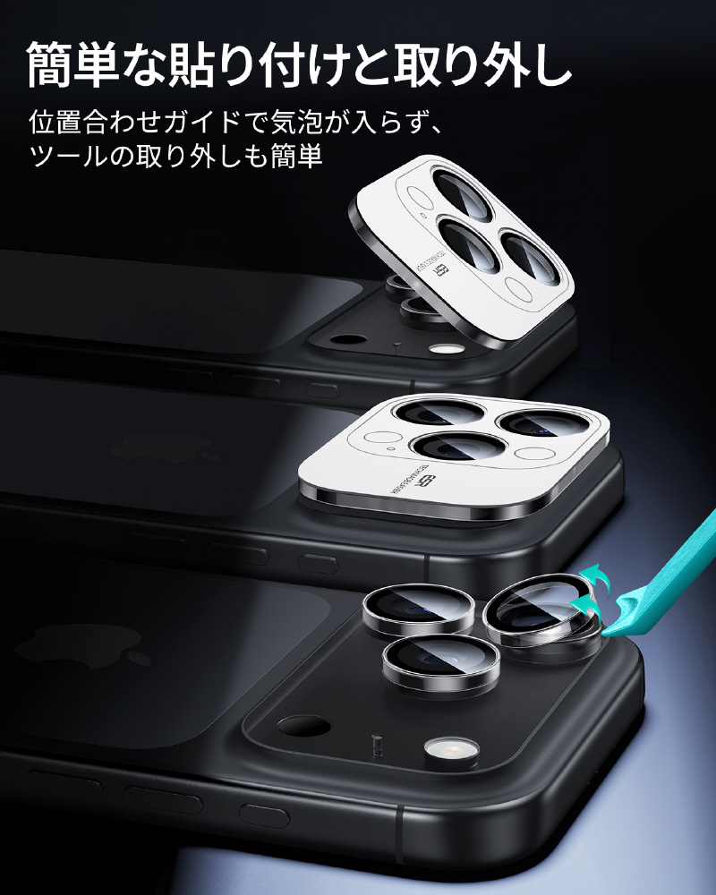 iPhone 17Pro/ProMax、16Pro/ProMax、15Pro/ProMax、14Pro/Pro Max用 強化ガラスレンズ保護 米軍企画の強力な耐久性の独立型設計の強化ガラスプロテクター。 気泡が入りにくい取り付けフレームと簡単に剥がせる取り外し器具付き。