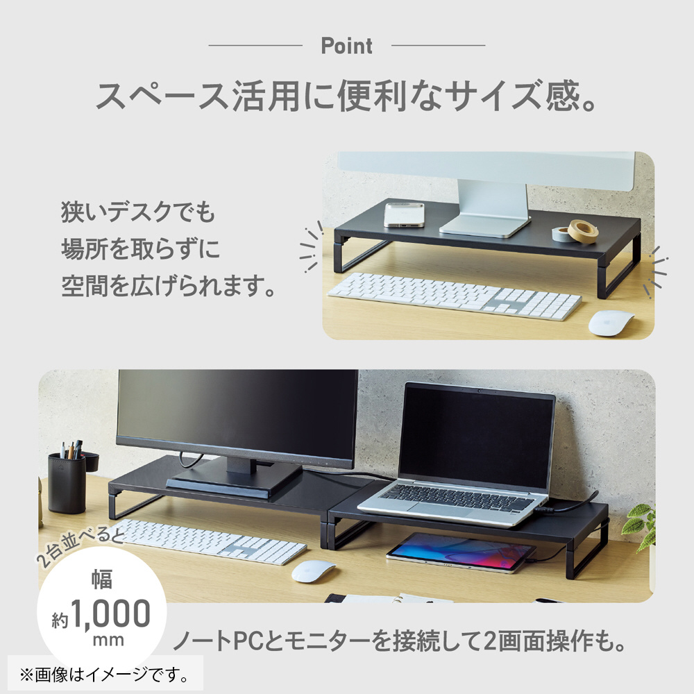 2台並べると約1mになるため、ノートPCとモニターを置いて接続すると、2画面操作が可能です。