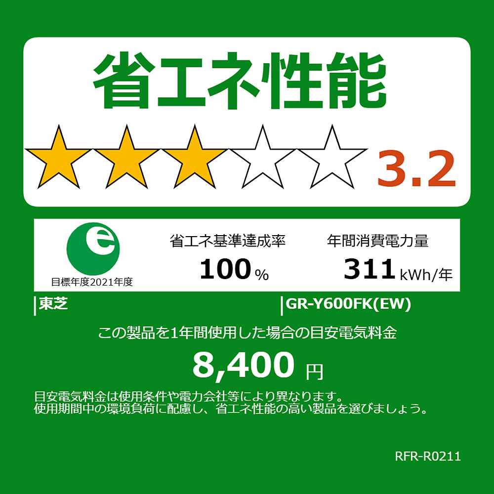 年間消費電力量 311kWh/年(JIS C 9801-3:2015)