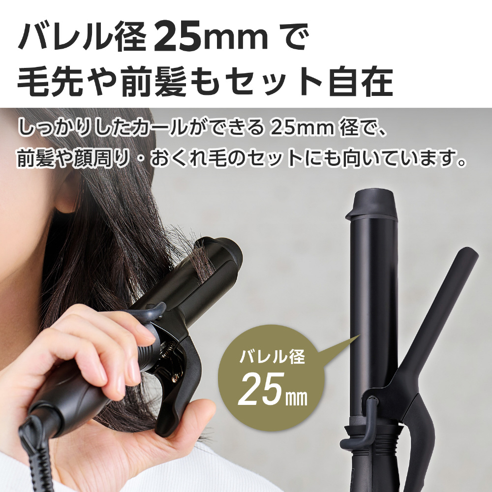 しっかりしたカールができる25mm径。ショートヘア〜ボブの方におすすめです。前髪や顔周り、おくれ毛のセットにも向いています。