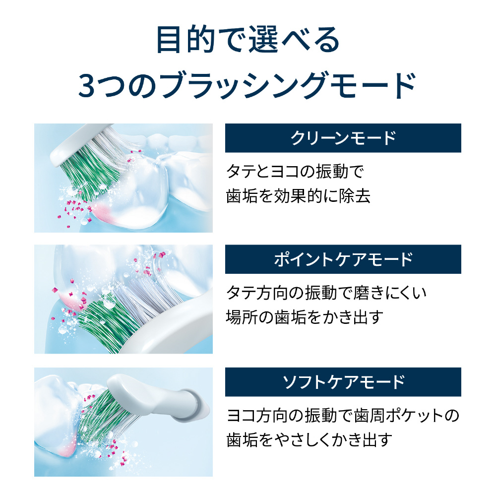 3つのブラッシングモード搭載(クリーンモード、ポイントケアモード、ソフトケアモード)