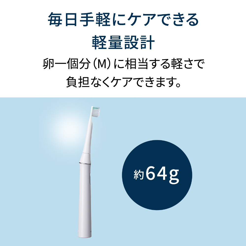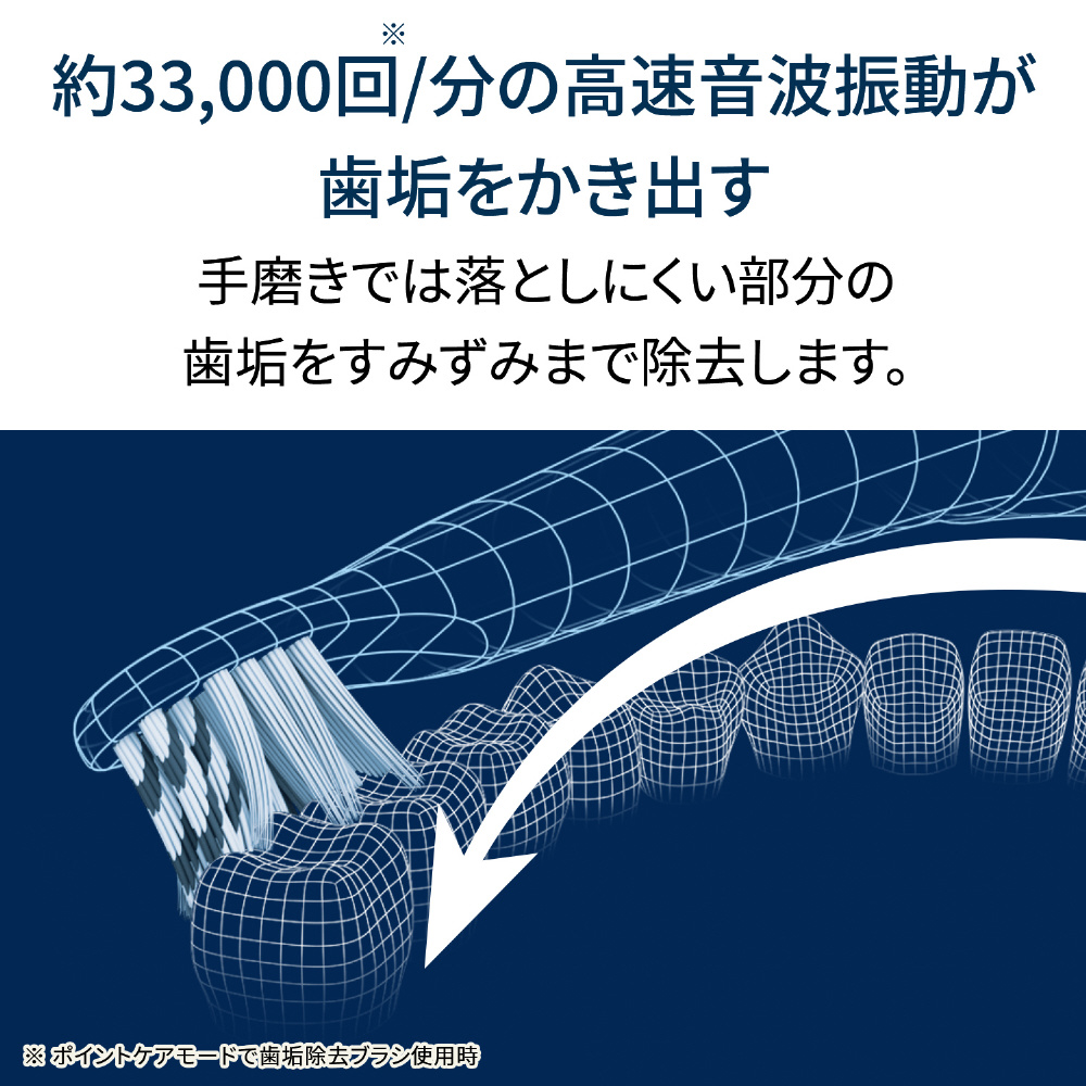 【ポイントケアモード】:約33,000回/分毎分33,000回で毛先がタテ方向に大きく振動し、前歯の裏側や奥歯など磨きにくい場所にも毛先が届き、歯垢をかき出します。