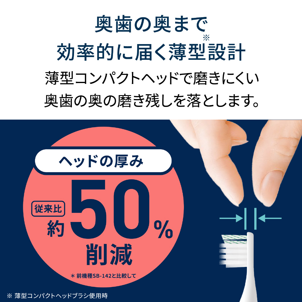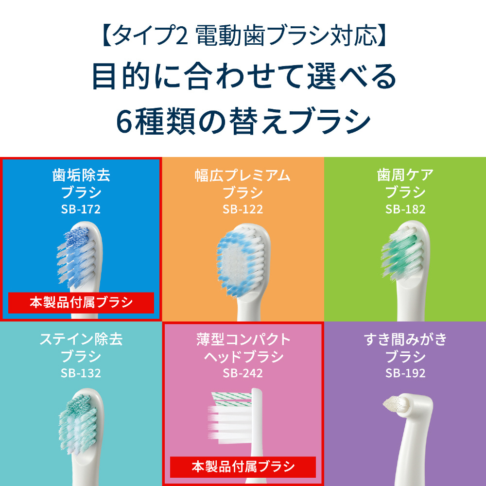 対応替えブラシについて歯垢除去ブラシ(2本)、SB-172幅広プレミアムブラシ(2本)、SB-122歯周ケアブラシ(2本)、SB-182ステイン除去ブラシ(2本)、SB-132すき間みがきブラシ(2本)、SB-192薄型コンパクトヘッドブラシ(2本)、SB-242ご購入の際は必ずタイプをご確認いただき、タイプ2の替えブラシをご利用ください。異なるタイプでは使用できません。