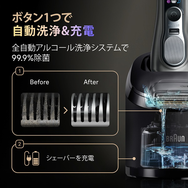 6 in 1 自動アルコール洗浄システムは、ボタン1つで洗浄、乾燥、充電を行い、ブラウン独自のアルコール配合で99.9%の細菌を除去します。