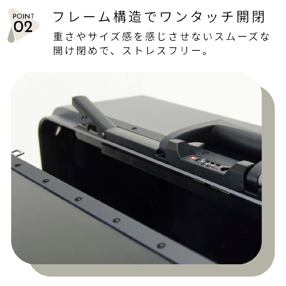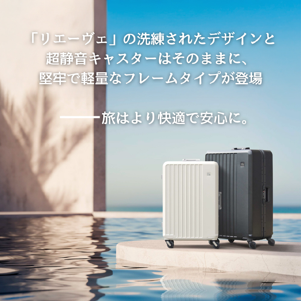 フリークエンター「リエーヴェ」のお洒落なデザインと超静音キャスターはそのままに、堅牢なフレームタイプが新登場。ワンタッチ開閉で素早くアクセスでき、出し入れもラクラク。機能性とデザイン性を両立した理想のフレームキャリーです。
