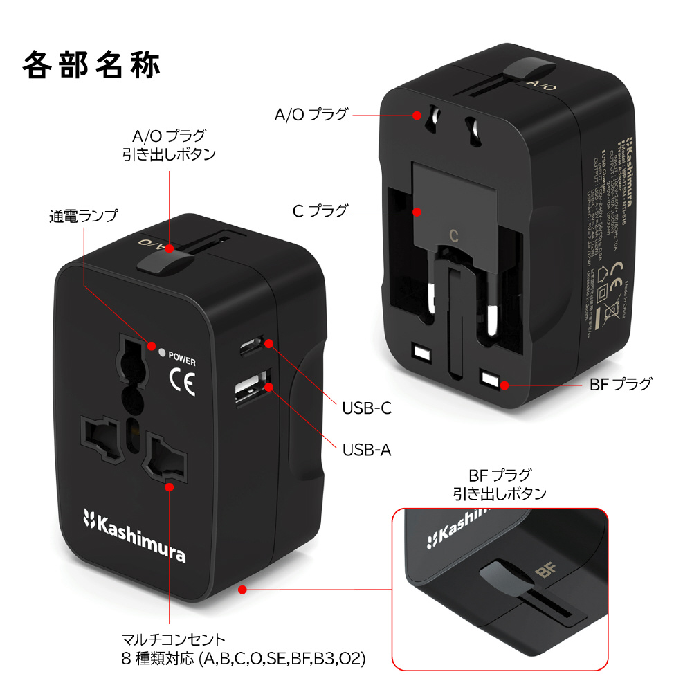 ■4種類(A,C,O,BF)の電源コンセントに対応する変換プラグ