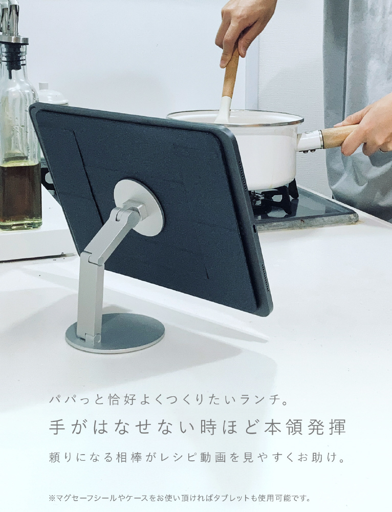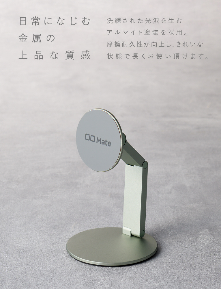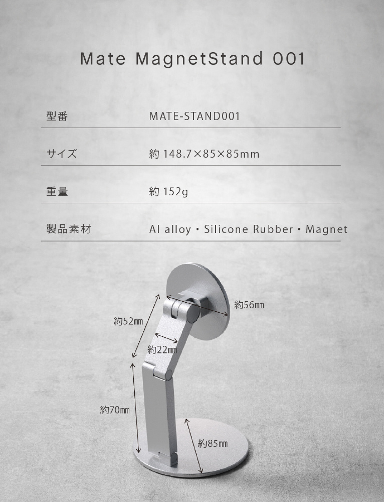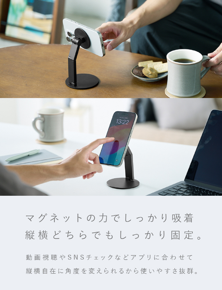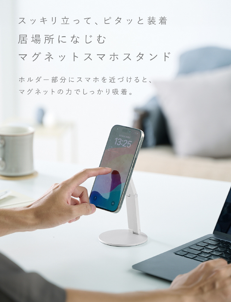 洗練されたデザインで、居場所になじむマグネットスタンド。しっかり吸着する為色んなシーンに便利!