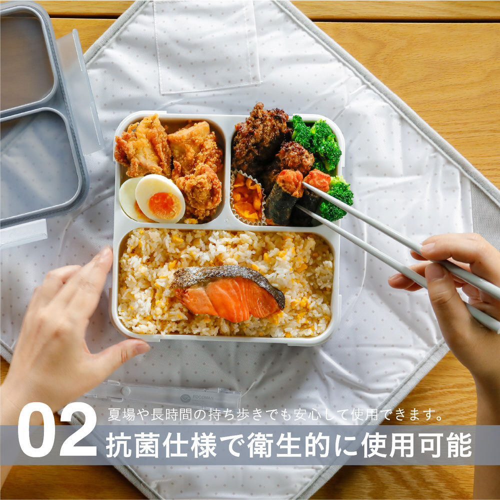 ガッツリ食べたい人向けのフードマン800ml。育ち盛りの学生などに最適です。正方形の器は、お弁当なのにランチプレートで食べているような見た目で美味しく食べられます。おかずもご飯も片手で持って食べられるので、ピクニックや机がない場所でも食べやすいのもポイント。