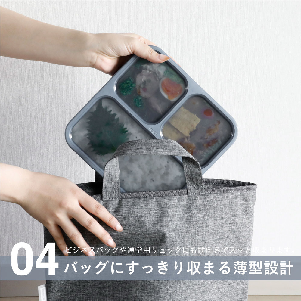 通勤や通学のバッグは、荷物でいっぱい!フードマンはそんなバッグにもすっきり入れられる「立てて運べる薄型弁当箱」。A4用紙の短辺と同じ210mmなので、書類などと一緒に持ち運んでも、すっきり収まります。ランチトートなど別持ちしなくて良いので、荷物が増えず通勤通学が快適!