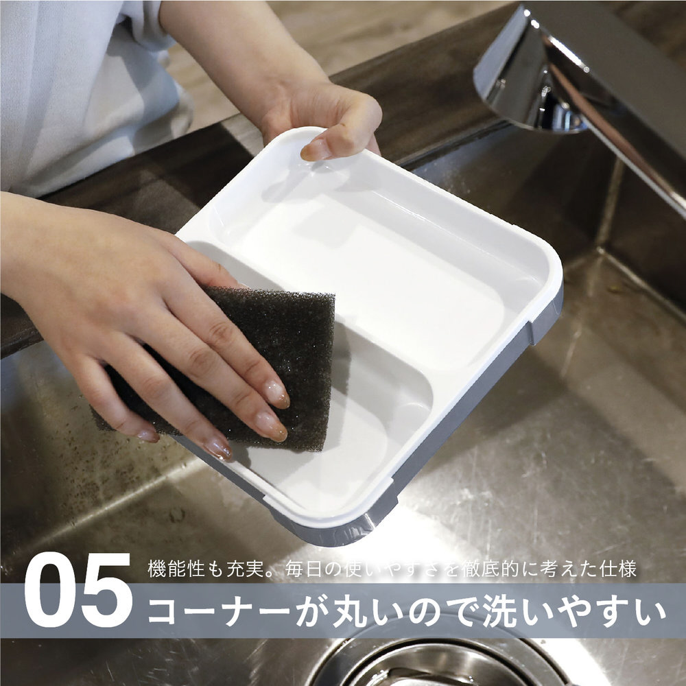 汚れが溜まりやすい「角」がない丸型コーナーなので、洗い物も簡単です。また、食器洗浄器対応なので、日常使いにも最適です。