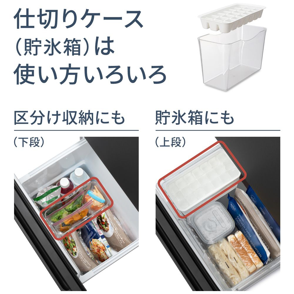 ・冷凍室の定格内容積60L。上段に深型ケースを採用、冷凍食品のタテ置き収納ができるから出し入れしやすい。