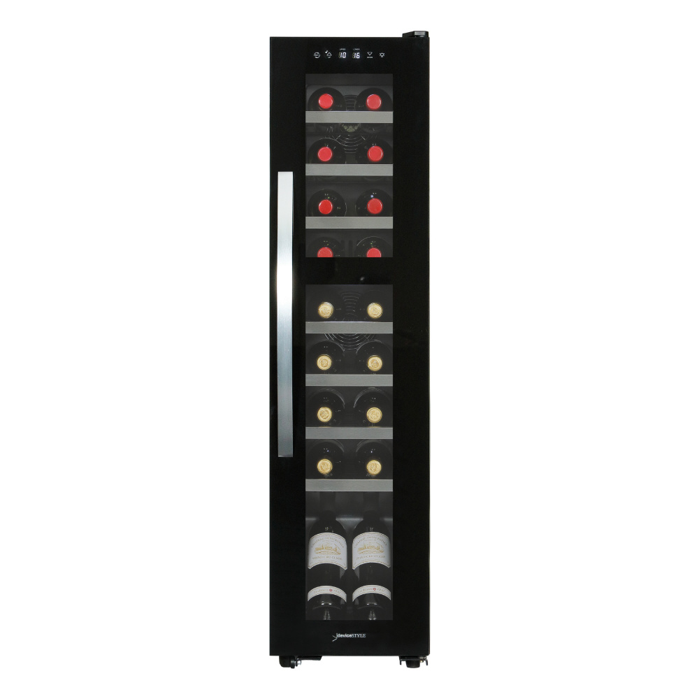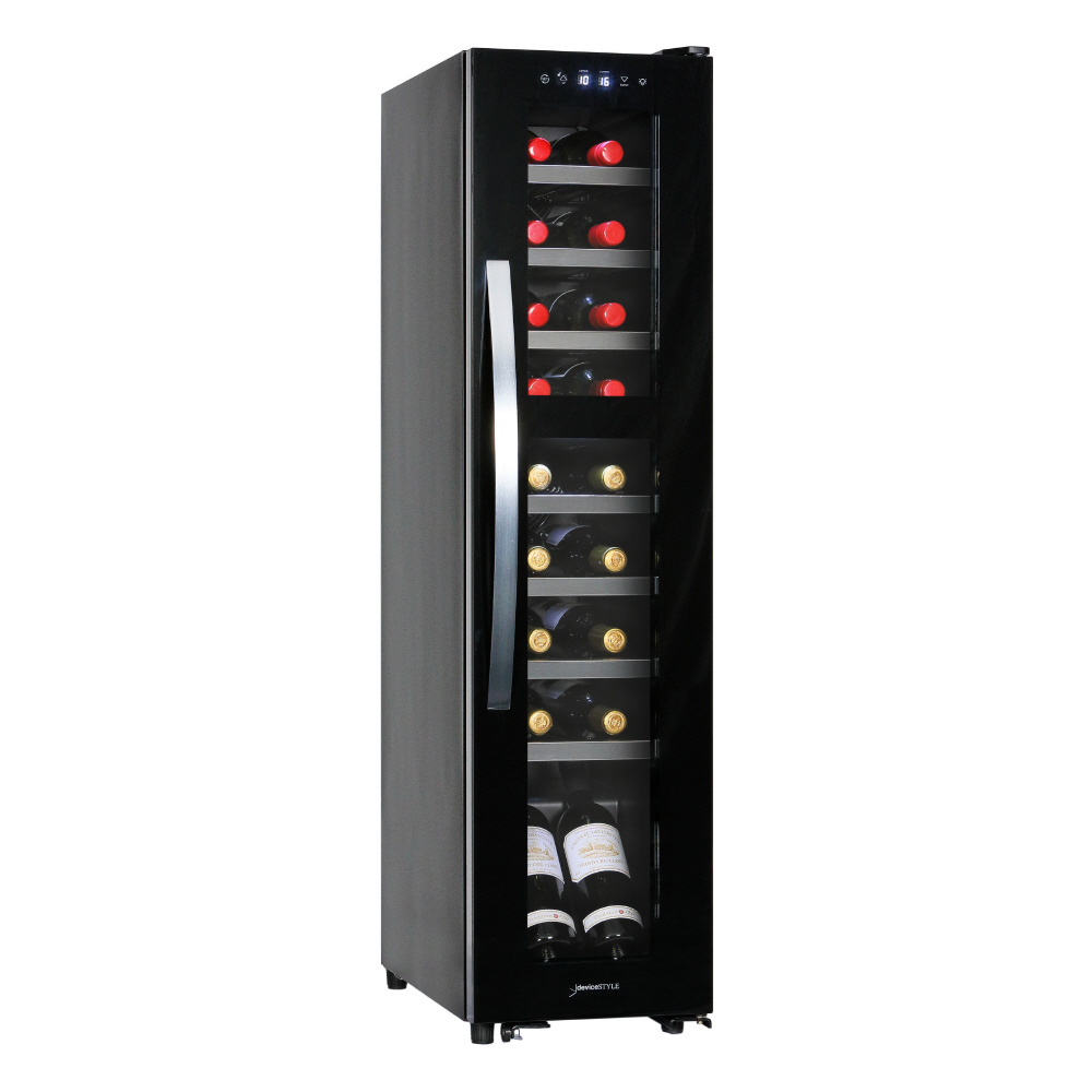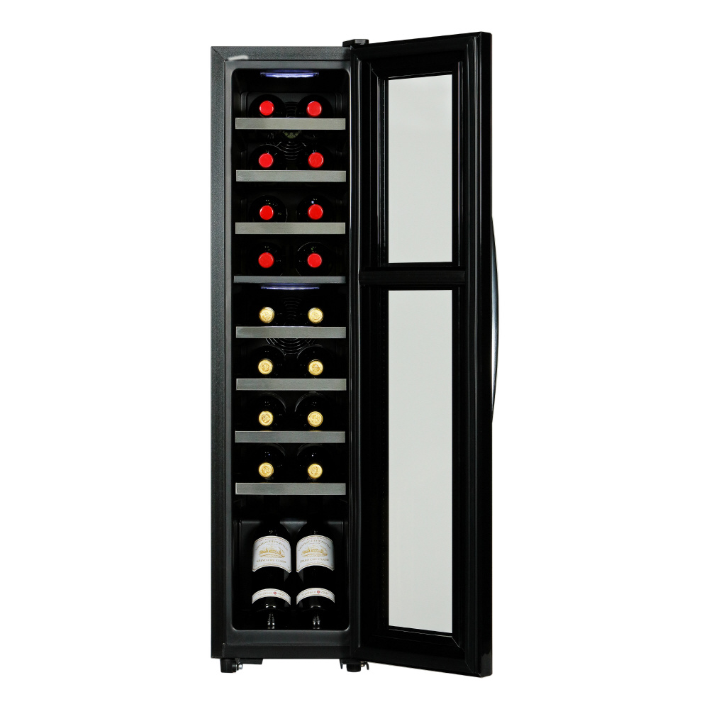 横幅わずか290mmのスリムボディですので据付場所を選びません。上下室ともにワインに適切な5 ~ 20℃の温度帯でそれぞれ設定可能な上下室完全独立制御。静粛性に定評のある当社上位機種 と同型コンプレッサを採用、庫内は多くのブルゴーニュタイプのボトルも収納可能な棚ピッチ90mmを確保しています。ボトルを魅せる斜斜め置きにも対応。