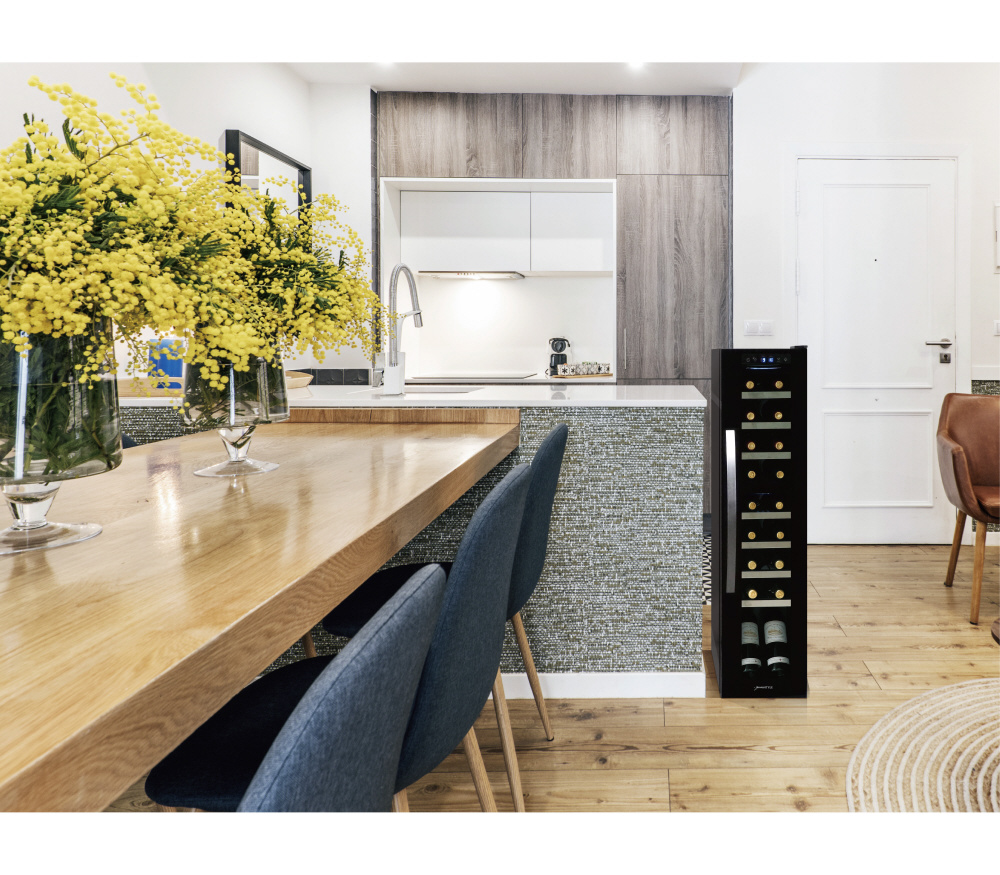 ちょっとしたすき間にも据え付け可能な幅わずか290mm*のスリムボディ。ブルゴーニュタイプのボトルも収納可能な余裕の棚ピッチ90mm。