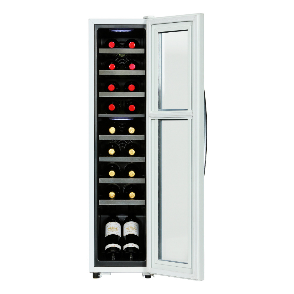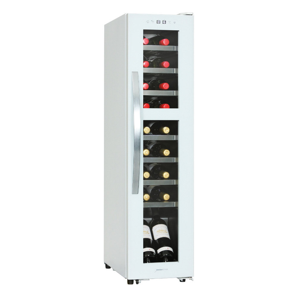 横幅わずか290mmのスリムボディですので据付場所を選びません。上下室ともにワインに適切な5 ~ 20℃の温度帯でそれぞれ設定可能な上下室完全独立制御。静粛性に定評のある当社上位機種 と同型コンプレッサを採用、庫内は多くのブルゴーニュタイプのボトルも収納可能な棚ピッチ90mmを確保しています。ボトルを魅せる斜斜め置きにも対応。