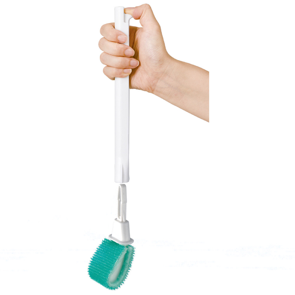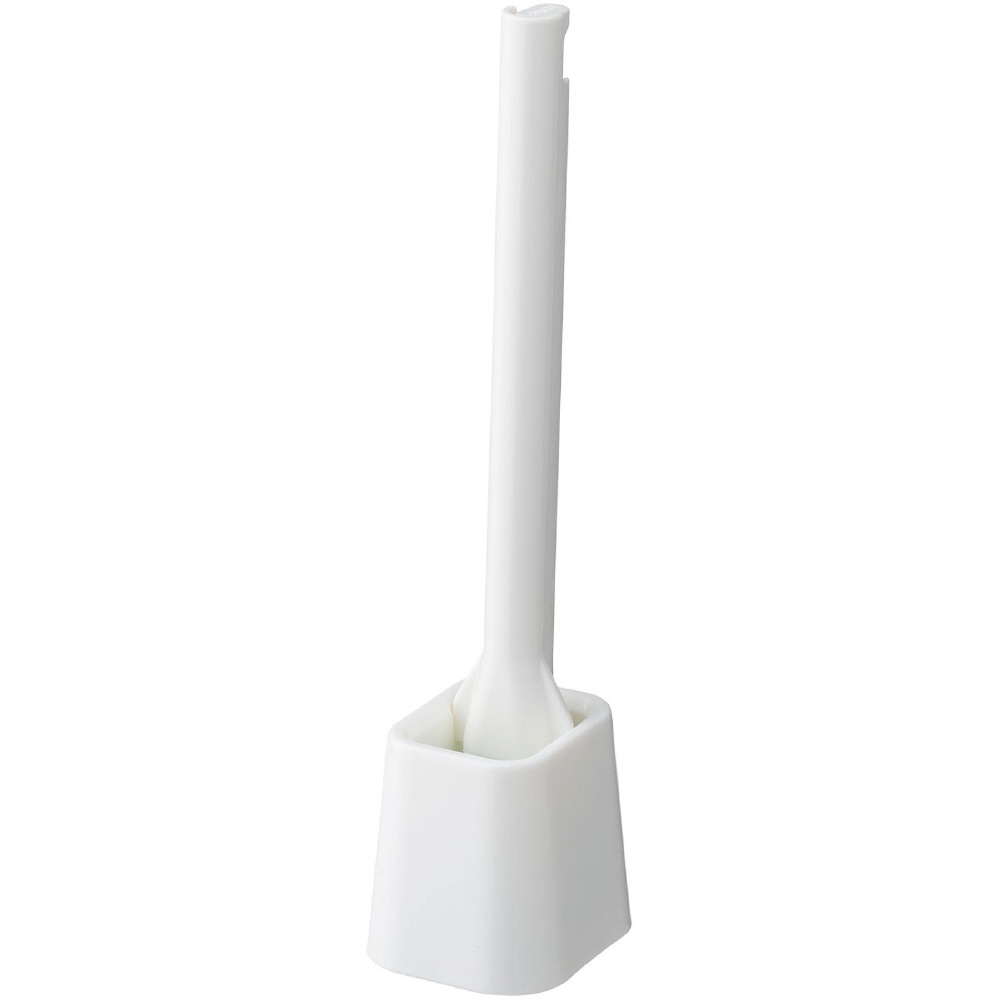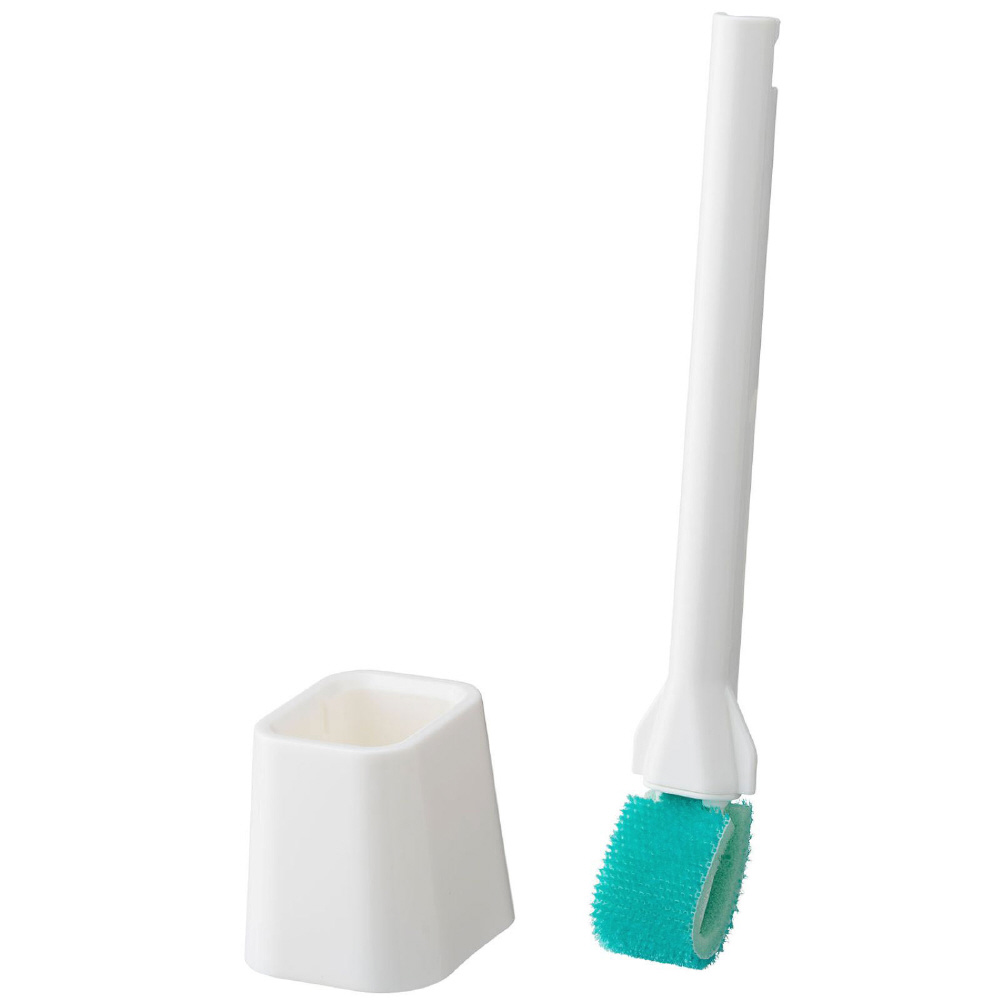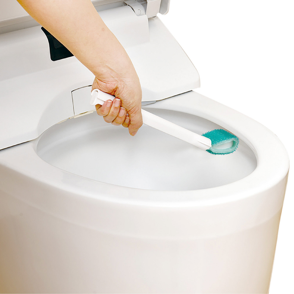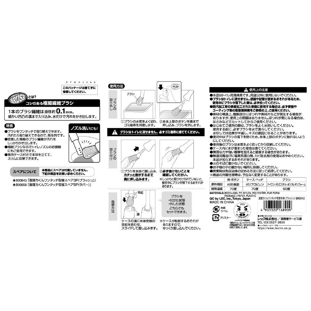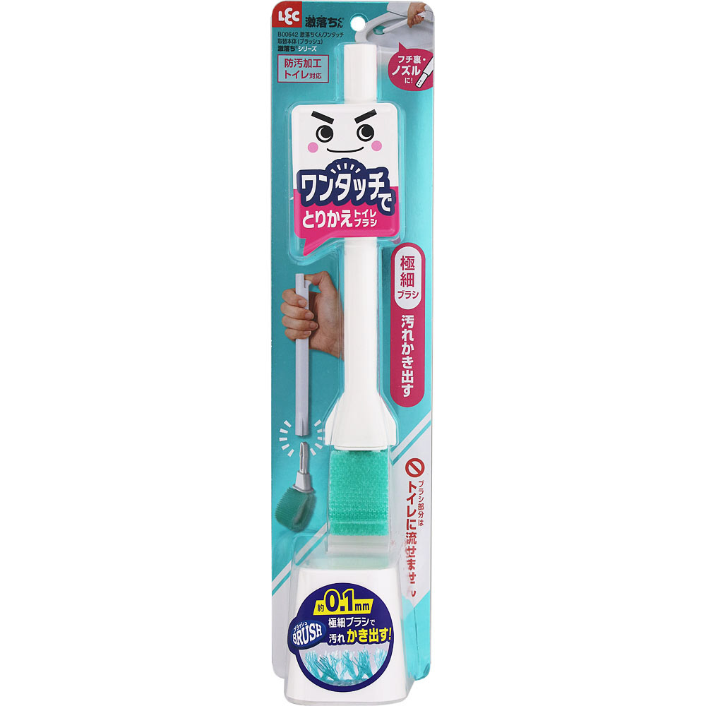 フチ裏・ノズルに! ワンタッチでとりかえトイレブラシ 極細ブラシ:汚れかき出す 約0.1mm 極細ブラシで汚れかき出す!  BRUSHとは? コシのある極細繊維ブラシ 1本のブラシ繊維は直径約0.1mm。 細かい凹凸の溝まで入り込み、水だけで汚れをかき出します。  ノズル洗いにも! ●ブラシをワンタッチで取り替えできます。汚れたら取り替えできるので、衛生的です。