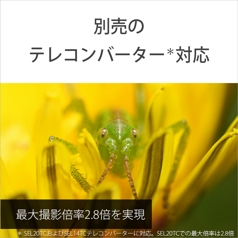 ●別売のテレコンバーター(*)の使用により、最大2.8倍の高倍率撮影を実現。被写体との撮影距離を確保しながらも高倍率な撮影ができるため、近づきにくい被写体の撮影や、物撮りでのライティングスペースの確保、影の映り込みを避けた快適なマクロ撮影が可能