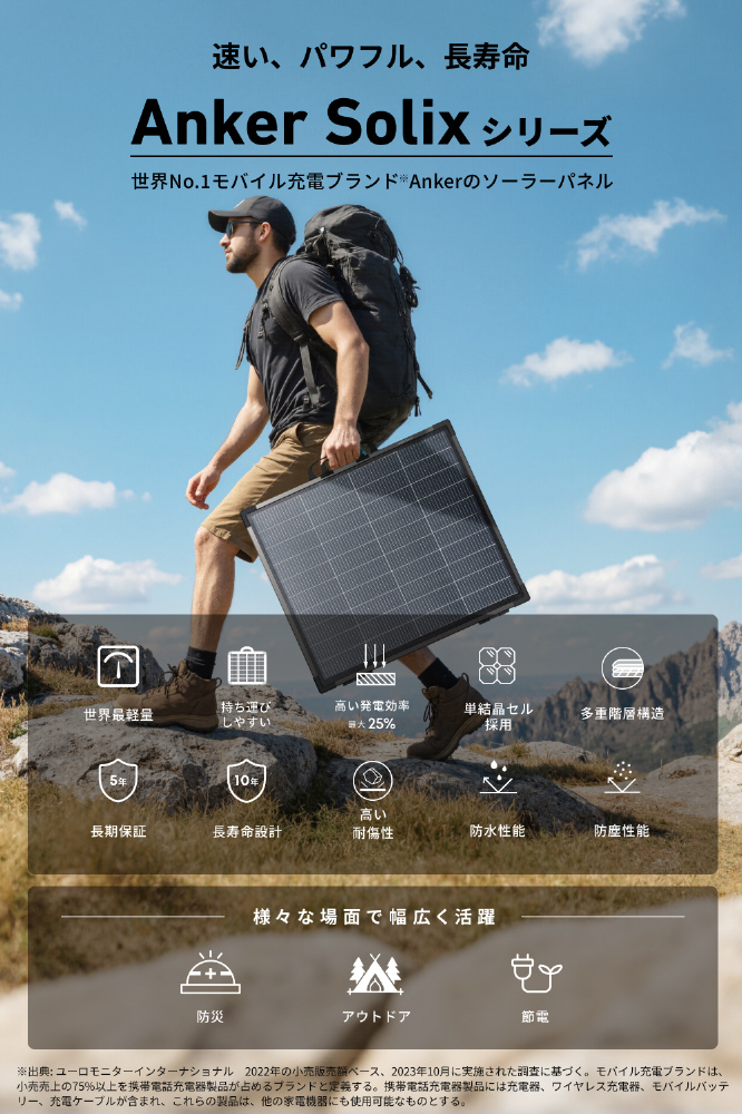 従来モデルの最大2年保証から、業界最長レベルの最大5年保証へと大幅にアップデートしました。キャンプやアウトドア、防災時など、より安心してAnker Solix PS100 Dual Portable Solar Panelを使い続けることができます。※両面発電の200W帯の折りたたみ式ソーラーパネルにおいて (2025年8月Anker調べ)