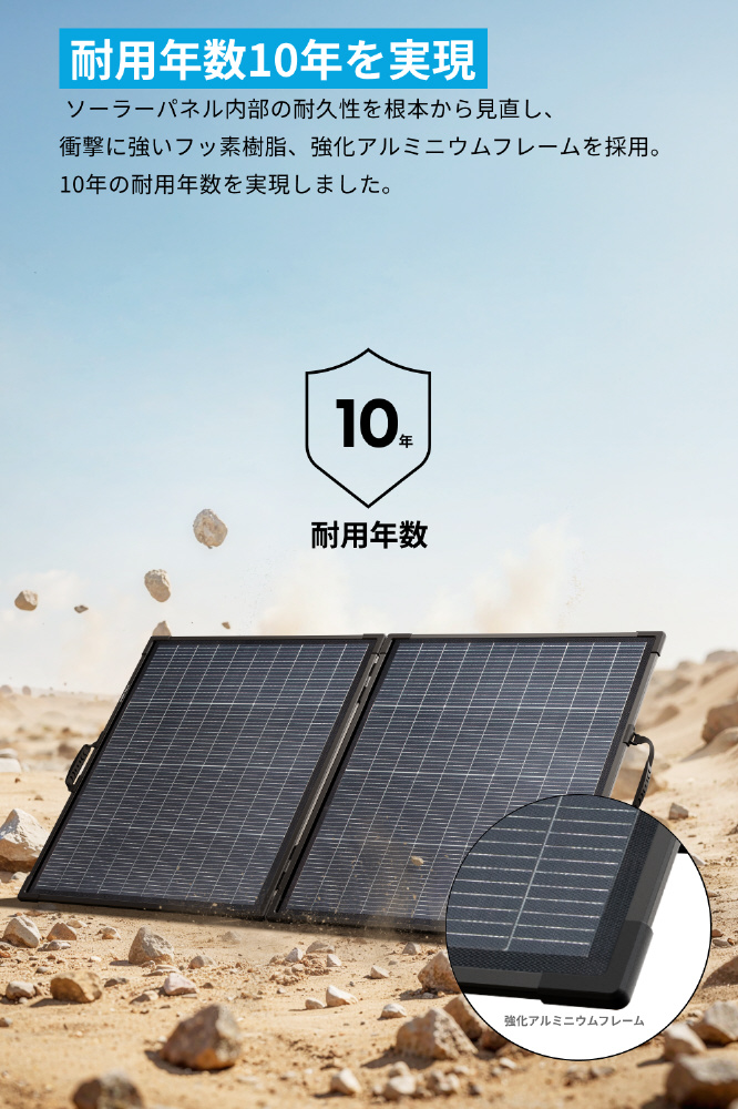 ソーラーパネル内部の耐久性を根本から見直し、多重階層構造や耐久性の高いETFE素材、衝撃に強いフッ素樹脂、強化アルミニウムフレームを採用し、10年の耐用年数を実現しました。