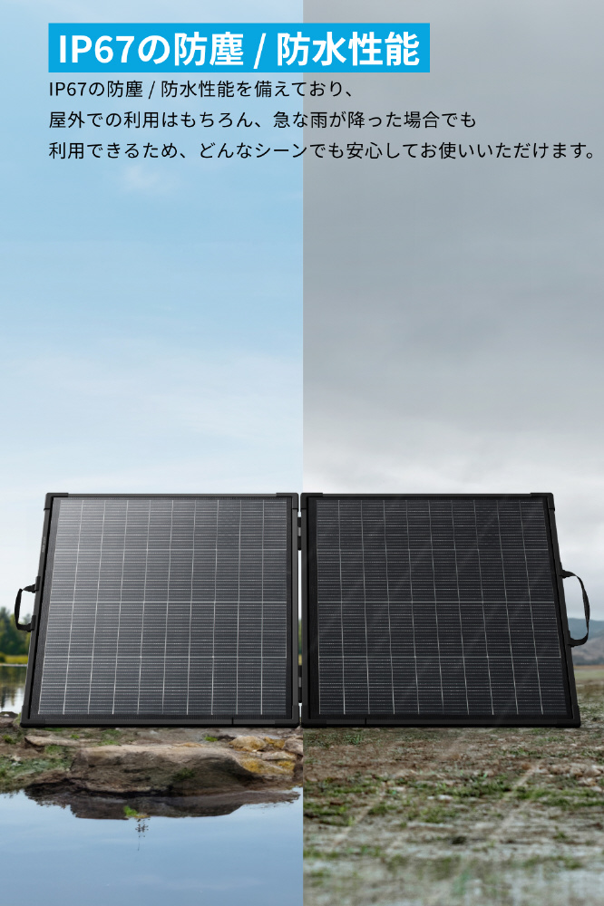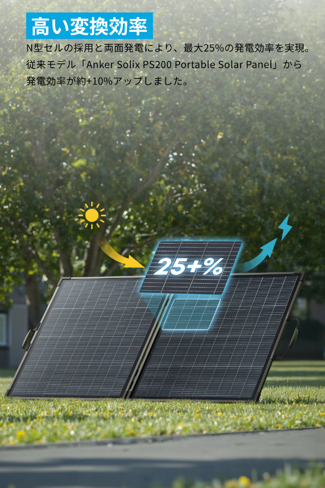N型セルの採用と両面発電により、最大25%の発電効率を実現。従来モデル「Anker Solix PS100 Portable Solar Panel」から発電効率が約+10%アップしました。本製品1枚でAnker Solix C1000 Gen2 Portable Power Stationを最短5.6時間で満充電が可能です。※天候や使用環境により実際に発電できる電力量は大きく変化するため、時間は異なる場合があります