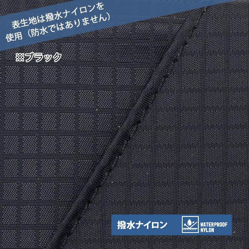 表生地は撥水ナイロンを使用。水をはじきやすく、汚れも付きにくいのでアクティブに使用できます。