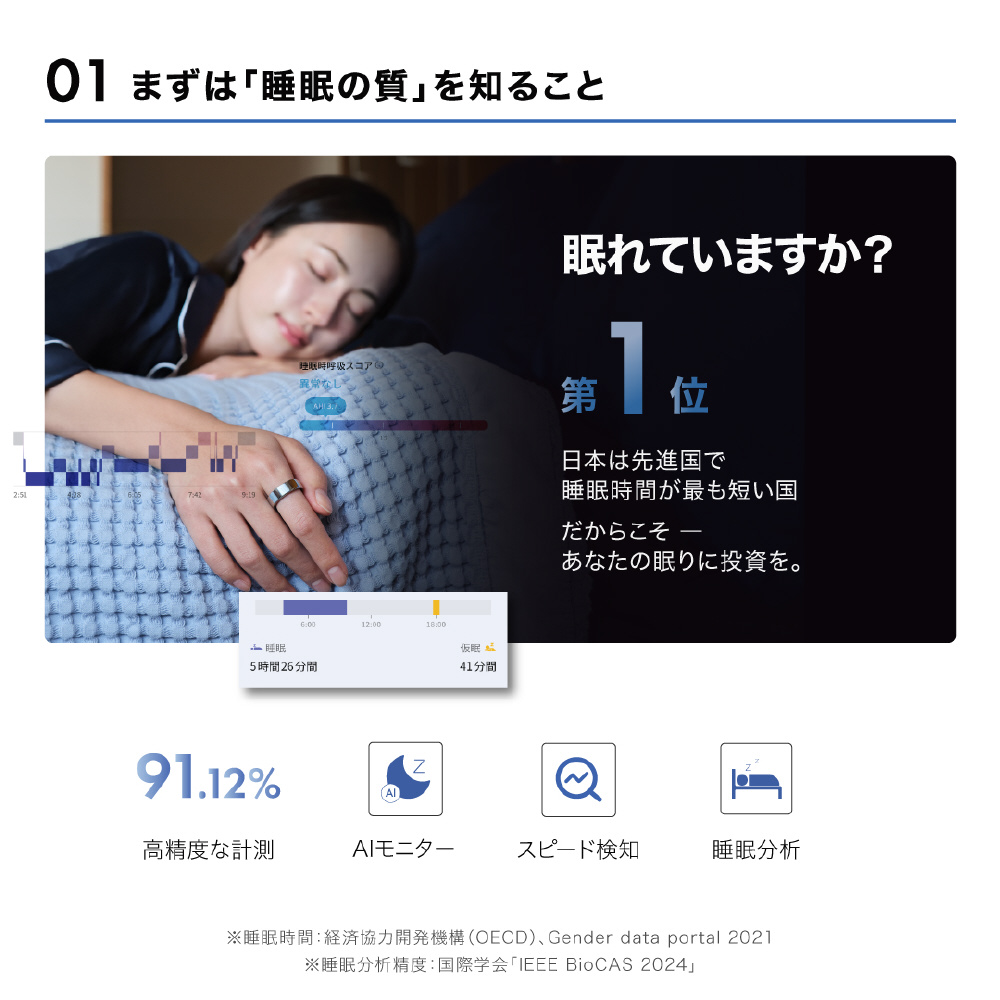 AIスマートリング RingConn Gen2 Series から「Gen2Air」 が登場。わずか2.5gの軽量デザインで、アクセサリー感覚で自然に着けられるため、仕事でもプライベートでも違和感なく日常に溶け込みます。高精度センサーにより、24時間体制で心拍数(HR)、心拍変動(HRV)、および血中酸素飽和度(SpO2)を2.5分ごとに追跡し、睡眠の質やストレス状態をやさしくモニタリング。専用アプリではデータが直感的に表示され、AIチャットがあなたの生活リズムを整えるヒントを提案。バッテリーは最長10日間持続し、毎日の充電ストレスも軽減。おしゃれを妨げないシンプルで洗練されたデザインは、ギフトにも最適です。