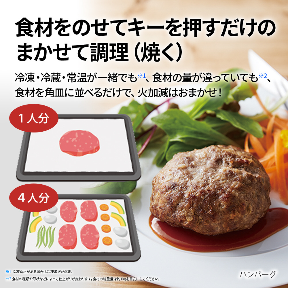 冷凍・冷蔵・常温が一緒でも、好みの種類・分量の食材を角皿において、「まかせて調理」キーを押してスタートするだけで、焼き物料理が自動でちょうどよく仕上がる「まかせて調理 焼く」。一度に複数のメニューが自動で完成するので忙しい毎日に役立ちます。※冷凍あり・なしの選択が必要です。